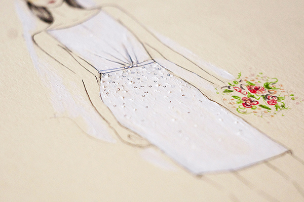 Ah, Sunday. The day for brunch, lazing, and walks in the park. Today’s dress fits right in there, rendered with white acrylic and pen on toned paper. A bit of micro-impasto lends some 3d edge to the degrade beading on the skirt.