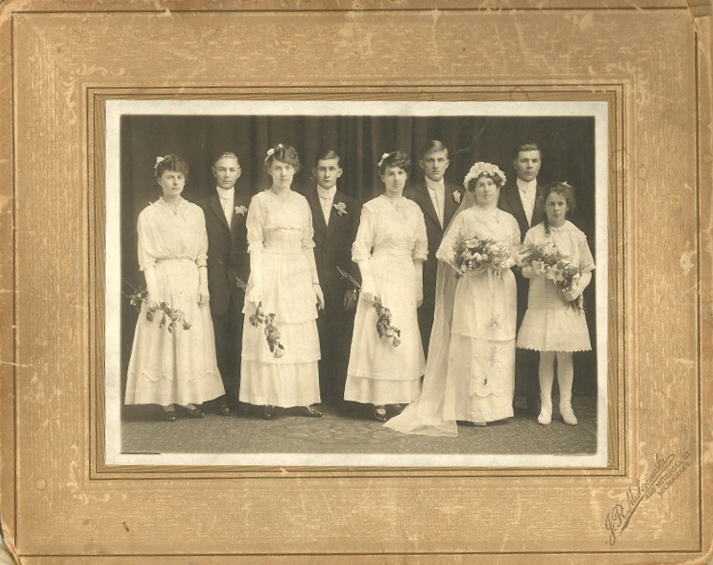 The two great-grandparent photos are divided by about a decade- or as I prefer to describe it, Downton Abbey Season 1 and Downton Abbey season 4. My paternal great-grandmother, Francis, represents the former. I’m seriously digging the flowers- the single rose for each of the bridesmaids is pretty chic. AND they’re rocking the mismatched bridesmaids look. I would kill to see these dresses up close- even in the black and white photo, you can see that there’s a ton of detail; pleated waistbands, layered skirts, lace aprons.